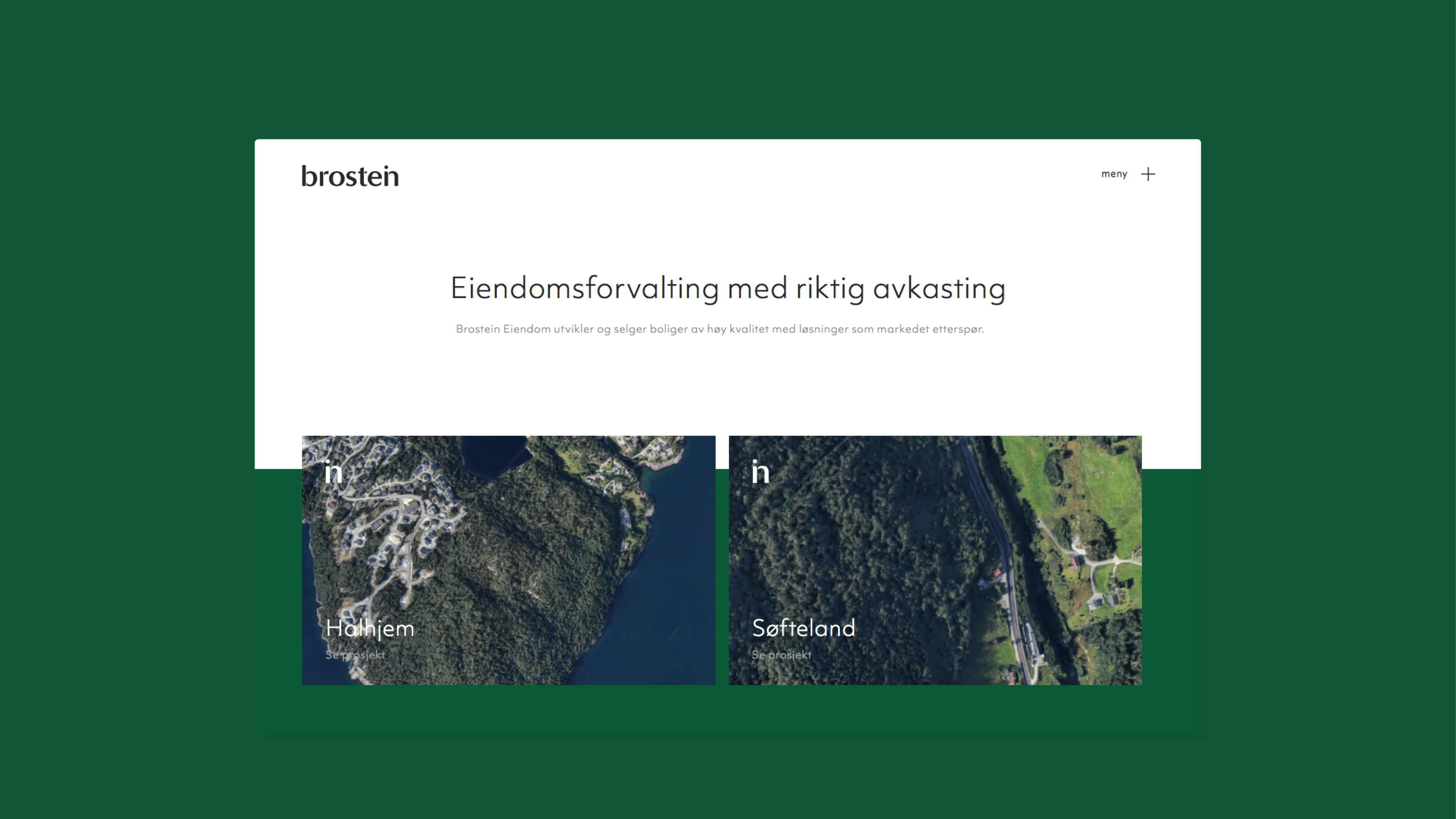 Brostein Eiendom AS ble startet i 2017, men eierne bak selskapet har lang og bred erfaring innen eiendom og finans. Gjennom de siste 15 årene har folkene bak Brostein Eiendom stått bak eiendomsutvikling i Bergen og omegn for nærmere 1.5 mrd kroner, både innen næringseiendom, og boligprosjekter.