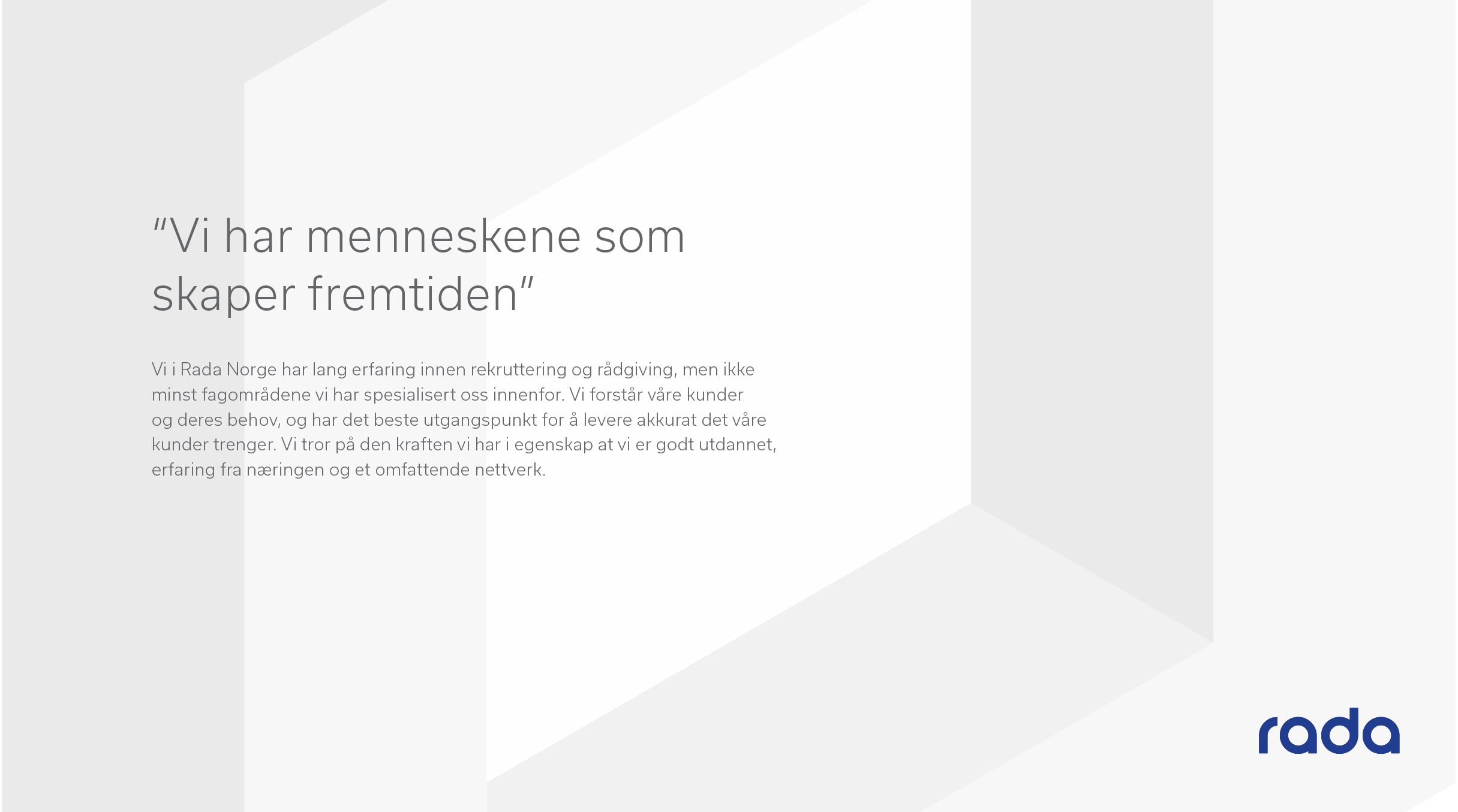 Rada Norge er et ledende konsulentselskap som leverer ingeniørkompetanse til de største selskapene i Norge. Rada leverer ressurser innen: bygg og anlegg, olje og gass, samferdsel og infrastruktur, energi/kraft, industri/teknologi og miljø.
